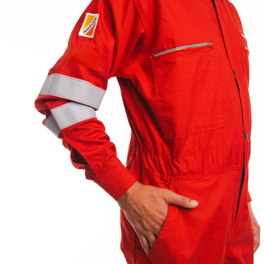 - Cintas reflectivas grises de 50mm cosidas en mangas y botamangas.